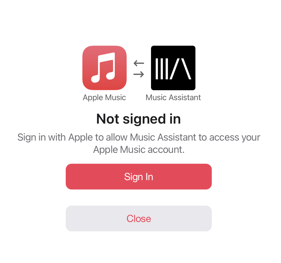 Section titled “Not yet supported”- Library interaction, such as adding and removing items to your Apple Music library from within Music Assistant